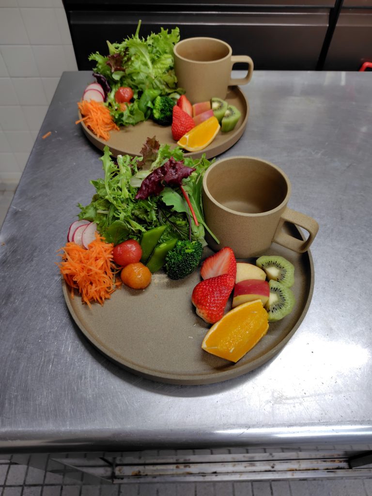 朝食は、旬の野菜(ブロッコリー、人参、ラディッシュ、菜の花など)、旬の果物(いちご、柑橘、りんご)を使用した朝食をご提供させていただきました。スープは、きのこと野菜のミネストローネ。